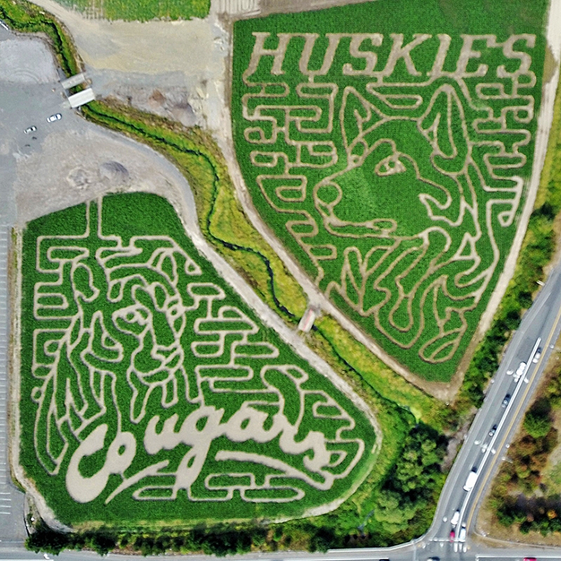 The Apple cup is up for grabs once again this year. Will the Cougars break the streak or will it be 8 in a row for the Huskies? Carpinito's has a corn maze for you, wherever your loyalties lie. Come to Kent, Washington and make some memories at this fun corn maze.