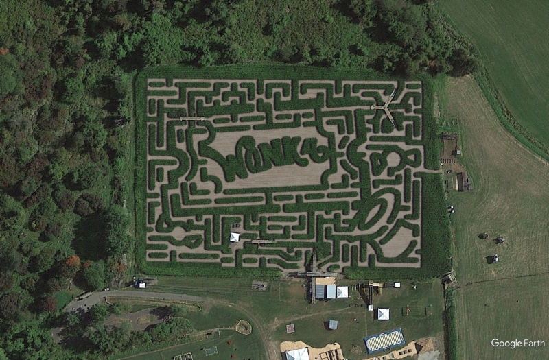 Davis Mega Maze in Sterling, Massachusetts has a Willy Wonka-themed corn maze. Come on out and find yourself while getting lost in this awesome corn maze.