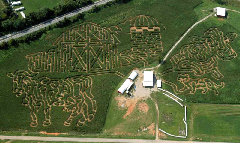 This maze design is in tribute to the dairy farms across America with 4 mazes on about 15 acres and a total of 6 mile of path to walk the place to be is in Jefferson City TN for a great day