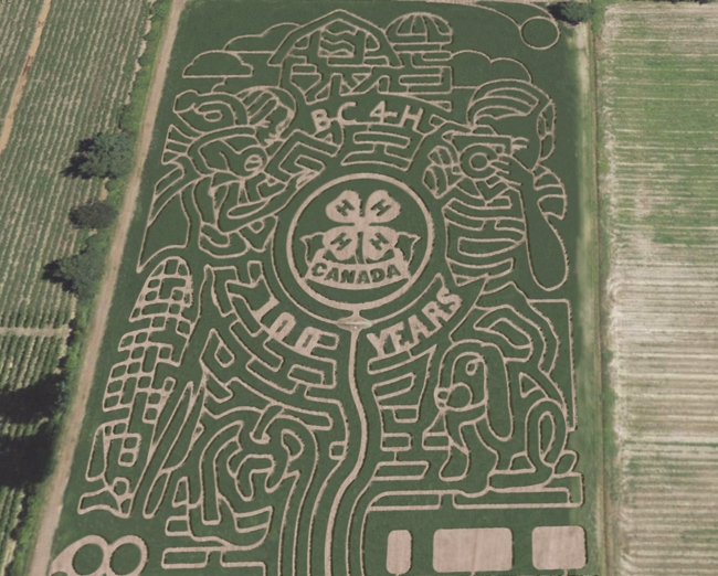 4-H is celebrated their 100 year mark in Pitt Meadows, BC. Canada. This maze celebrates 4-H with a hike of 5.4 miles in the 10 acre + design.