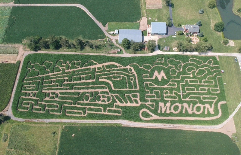 Kregels Pumpkin Patch corn maze located in Lowell, Indiana. Kregels chose a historical maze design this year to highlight their area. There used to be a railroad line that ran from Monon Indiana up to Chicago, and have several other branches to Indianapolis and other places in Indiana. This years corn maze has an image of the old train that used to run that line. Learn history and have fun while navigating this years corn maze.