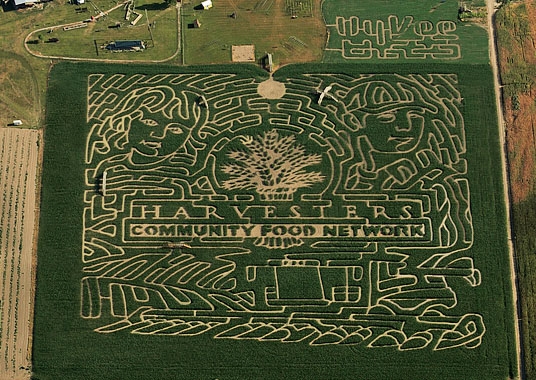 A design to pay tribute to the Community Food network for all they have done in the Liberty MO area there are 4 mazes and 10 mile of path to walk while navigating your way through without getting lost in this 20+ acre field