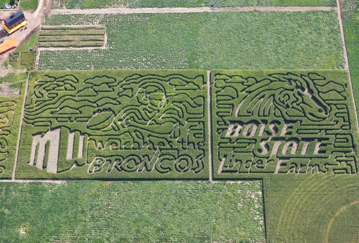 Total support for the local University sports in this sponosred maze design on over 11 acres with 3 mazes for 5.6 miles of pathway to find your way through in Meridian ID