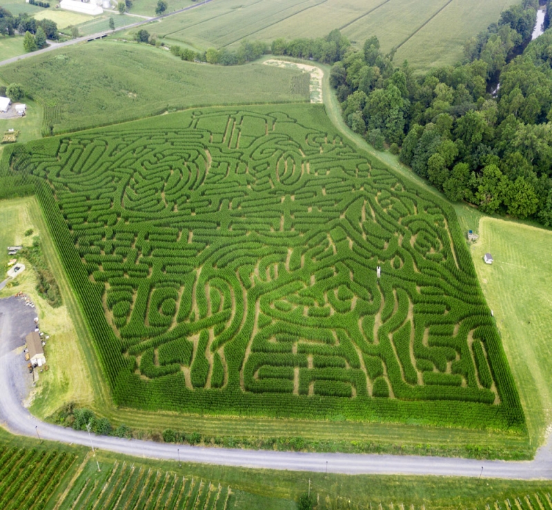 North River Farm’s corn maze in Bridgewater, Virginia, is all about farm life. This fun maze offers three paths that can be taken in the shape of a tractor and a horse. Get lost in Virginia!