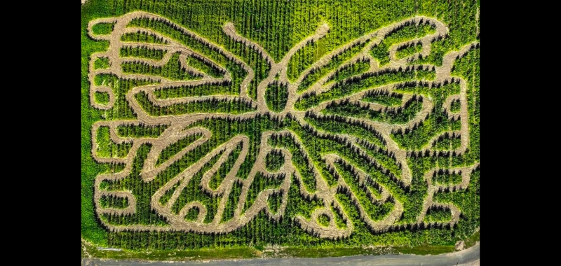 Packer Orchards corn maze located in Hood River, Oregon, nestled in the foothills of Mount Hood. This year Packer Orchards went with a Butterfly theme for their corn maze. As you navigate the buttterfly corn maze, you can enjoy the serenity of a peaceful fall day in the beautiful countryside.