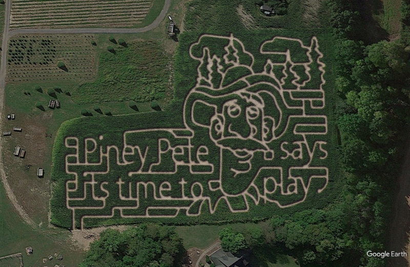 Piney Pete says, "It's time to play!" Come to Piney Acres in beautiful Fortville, IN to see this Piney Pete themed design this year. Come on out and and have fun playing with Pete at this entertaining corn maze.