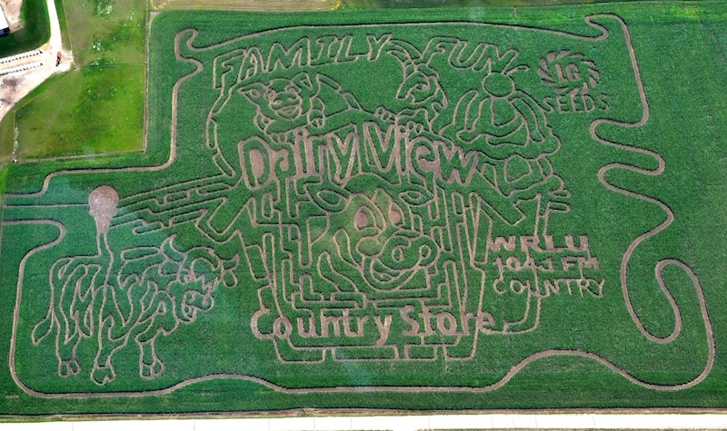 A sponsored design with the logos incorporated this depicts the dairy life in Sturgeon Bay, WI. The 4 maze design is on about 22 acres and has 9 miles plus of maze path to work your way around in.