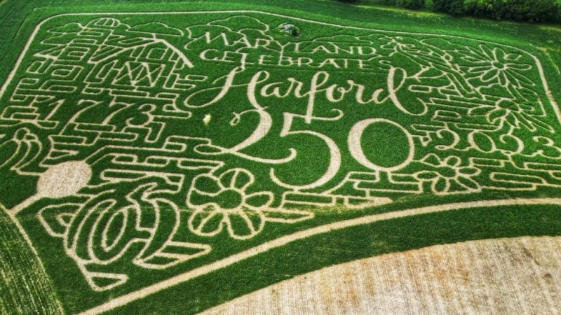 Located in Darlington, Maryland this corn maze celebrates the 250th anniversary of their county. What better way to raise awareness of a county celebration than with a fun design that depicts some of the items that make this area of the world unique. Bring the faamily out to enjoy the miles of twisting and turning paths that form this unique design.