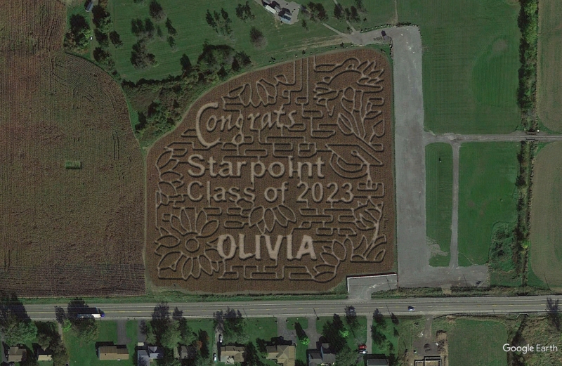 What better way to congratulate a group of students for a job well done than to put their graduating class in a corn maze design. This maze is located in Sanborn, NY and it is a blast to go through their corn maze in the fall. The subtle sunflowers add to the fun that this farm offers.
