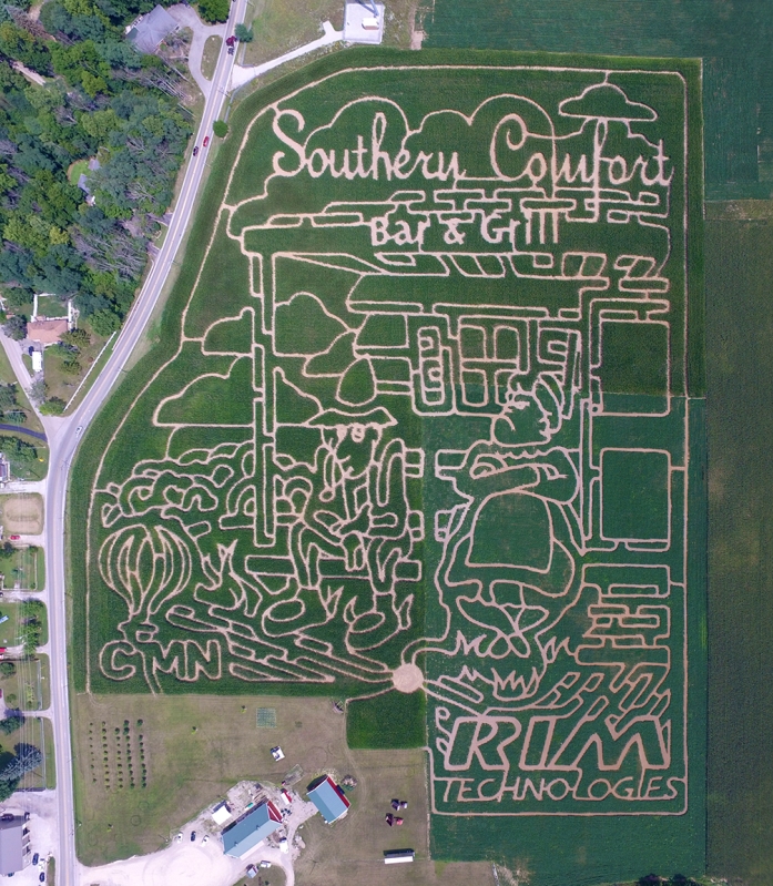 Today’s Harvest Corn Maze located in New Paris, Ohio, features sponsorships from Southern Comfort Bar and Grill, CMN, and RIM Technologies. The 2016 design shows a scene from outside the bar and grill. Each year Today’s Harvest donates the cash value of their corn crop to Dayton Children’s Hospital.