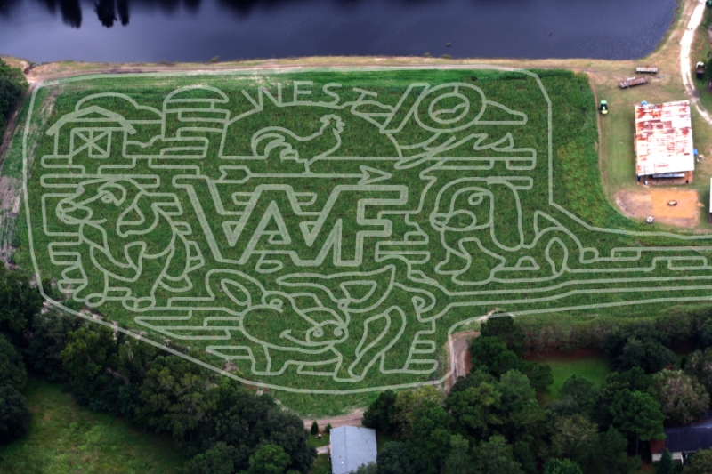 The farm animals in this maze are helping West Farms in Summerville, SC celebrate 10 years with 3.2 miles of trail path on around 6 acres you can join them.