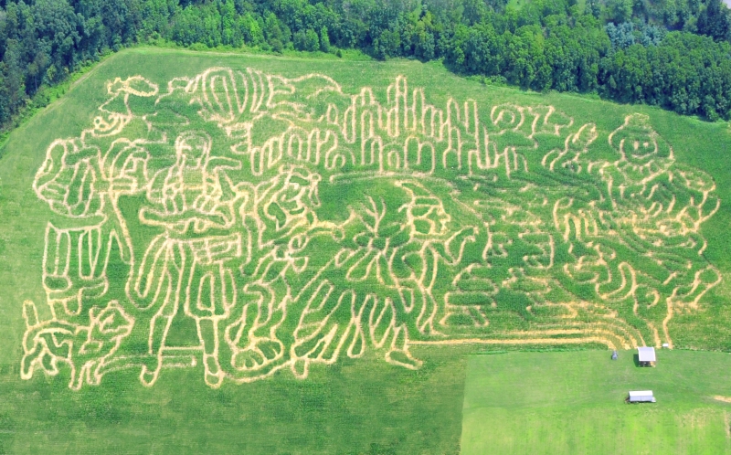 Travel to Oz with the Tin Man, Lion, Scarecrow, and Totto on this mazes yellow brick road finding your way in the 3 maze, almost 18 acre design navigating the 8.2 miles of path cut out of the corn