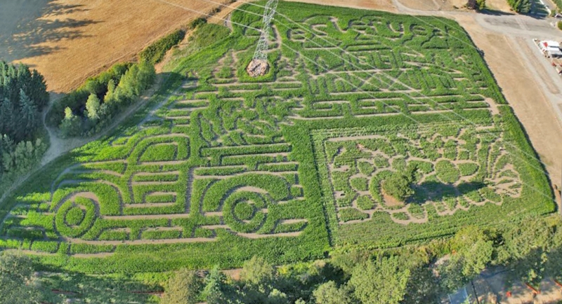 Yesteryears corn maze located in Tualatin, Oregon decided to go with a corn maze design that reflected their logo. The barn old truck, and logo was a great design to start their first season as a corn maze. Enter the maze and work your way through the old truck, pine trees, and barn to eventually escape the maze. One of these mazes was also planted in sunflowers